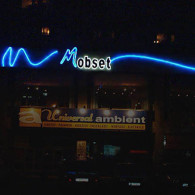 MOBSET: The tridimensional letters made of the galvanized sheet with the shaped neon tube placed on the face, on the outline of the letters. The winding line made of the shaped neon tube placed on the front.
