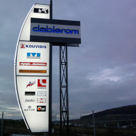 DABLEROM: The giant Totem indoor lighting with the neon tube shaped on the curve edge; the individual letters with halo illumination type